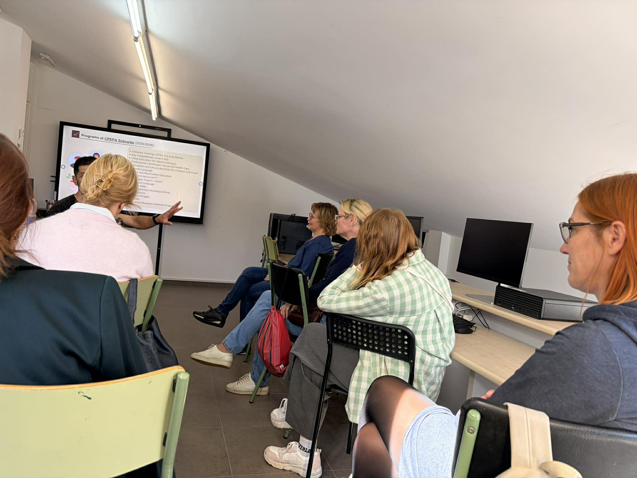 Õpirände esimese päeva jooksul külastasime mitmeid tunde. Inglise keele tundides osalesid meie õpetajad vestluspartneritena, aidates õppijatel arendada suulist väljendusoskust nig jälgisid, milliste meetoditega lahendavad sealsed õpetajad eri tasemete keelebarjääri. Hispaania keele tunnis suhtlesime sisserändajatega inglise, prantsuse, vene ja hispaania keeles, mis andis hea ülevaate mitmekeelsest õpikeskkonnast. Samuti osalesime arvuti algõpetuse tunnis, kus õppijad harjutasid esitluste koostamist Canva keskkonnas ning failide korrektset salvestamist ja haldamist.